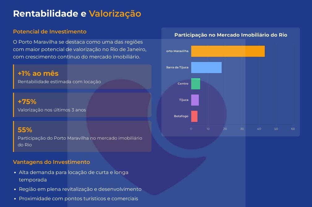 O Porto Maravilha se destaca como uma das regiões com maior potencial de valorização no Rio de Janeiro, com crescimento contínuo do mercado imobiliário. A região portuária tem a maior participação no mercado imobiliário do Rio de Janeiro.